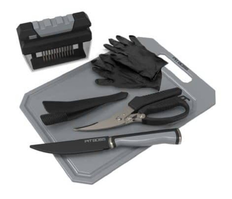 Med Pit Boss Food Prep Kit får du et komplett sett med verktøy som gjør kjøttforberedelse enklere, mer presis og hygienisk. Settet inkluderer kjøttmørner, membranfjerner for ribbe, trimkniv (12,7 cm), benklipper, et solid skjærebrett (25,4 x 35,6 cm) samt 10 engangshansker i nitril.